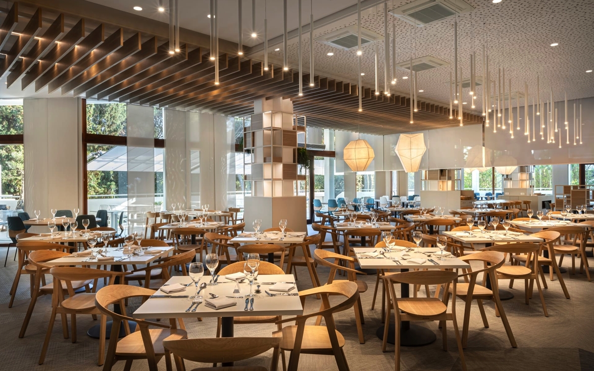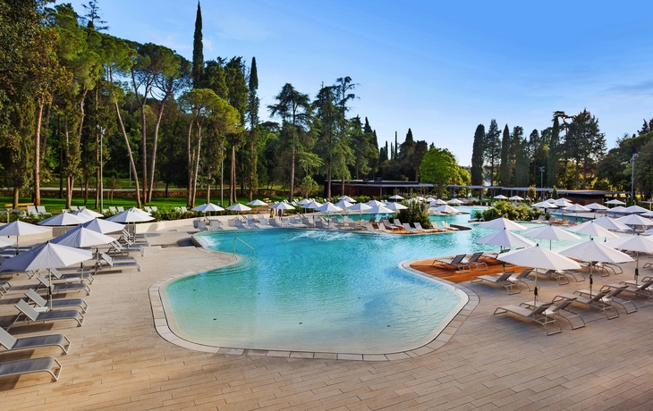 Das Hotel mit 325 Zimmern verfügt über zwei Restaurants, drei Bars, einen Außen- & Innenpool, einen Privatstrand mit Liegestühlen und Sonnenschirmen, ein Wellness & Spa-Zentrum, einen Fahrrad- und Elektrofahrradverleih, Konferenzsäle und kostenloses WLAN im gesamten Hotel. Die Doppelzimmer sind mit Dusche oder Bad/WC, Föhn, Klimaanlage/Zentralheizung, SAT-TV, Safe, Schreibtisch, Telefon, Minibar und Balkon mit Blick auf den Park ausgestattet. Die Doppelzimmer zur Alleinbenutzung verfügen über dieselbe Ausstattung wie die Doppelzimmer.