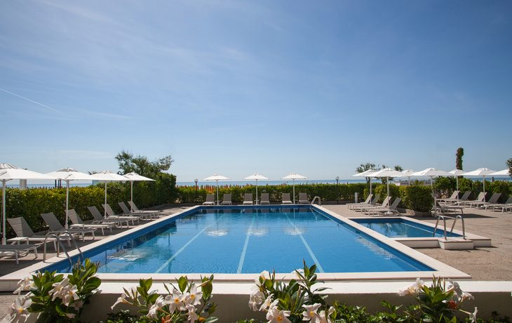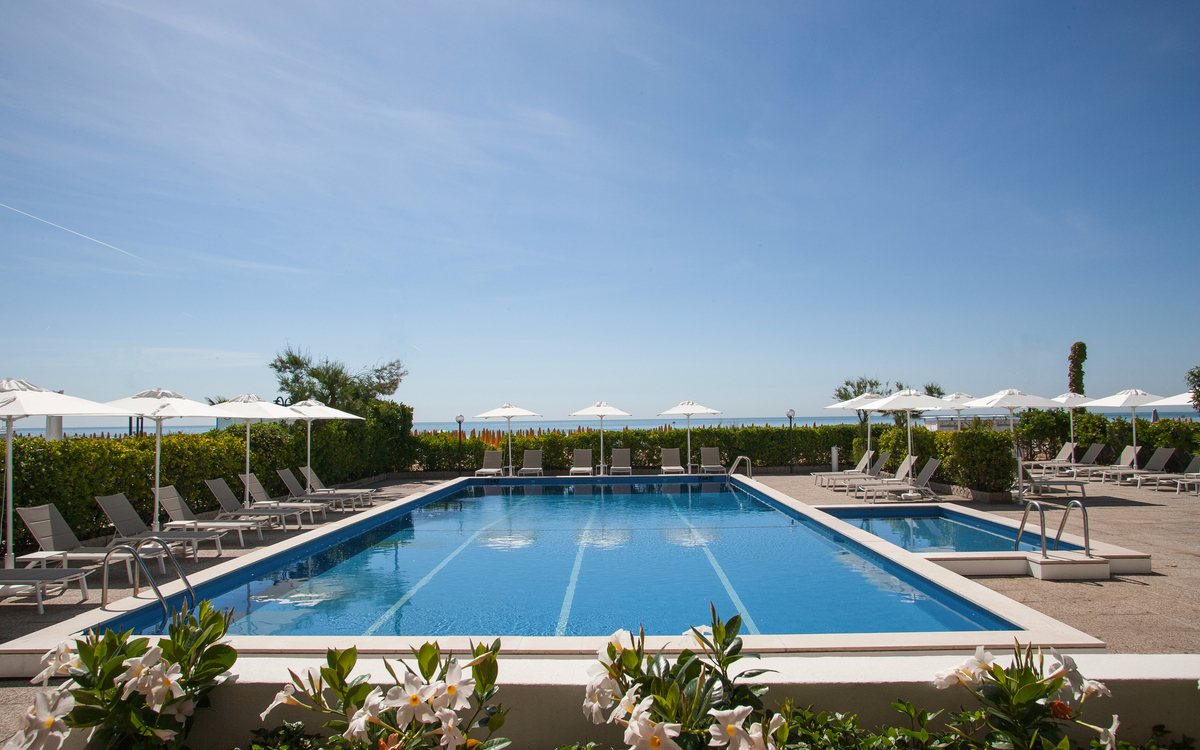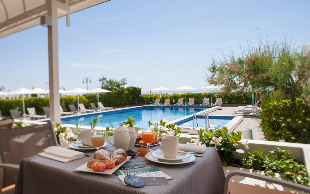 Es erwartet Sie ein hoteleigener Badestrand mit Sonnenliegen, Schirmen, Duschen und Umkleidekabinen. In der Hochsaison von Montag bis Freitag wird Animation am Strand angeboten. Das Hotel verfügt über einen großzügigen Außenpool mit Meerblick sowie einen separaten Kinder-Mini-Pool und eine Poolbar mit Sonnendeck – eine gepflegte Wohlfühl-Oase für Gäste jeden Alters. Der Poolbereich ist täglich von 09:00 bis 12:00 Uhr und von 15:00 bis 19:00 Uhr geöffnet. An Pool oder Strand kann 1 Sonnenschirm und 2 Liegen (Doppelzimmer) bzw. 1 Sonnenschirm und 1 Liege (Einzelzimmer) für 10,-€ pro Tag an der Rezeption reserviert werden, je nach Verfügbarkeit). Nach dem Abendessen lädt ein Bummel durch die charmante Fußgängerzone ein – gesäumt von kleinen Boutiquen, gemütlichen Bars und liebevoll geführten Läden. Sie können sich im Hotel auch kostenlose Fahrräder leihen, um Jesolo zu erkunden. Pool- / Strandhandtücher sind vor Ort gegen Gebühr erhältlich.