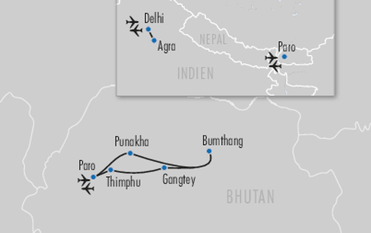Zwei Länder, zwei Welten – und eine Reise, die Sie nie vergessen werden! Erleben Sie das pulsierende Herz Nordindiens mit seinen weltberühmten Bauwerken und tauchen Sie ein in die stille Spiritualität Bhutans, dem sagenumwobenen Königreich im Himalaya. Zwischen Marmorkunst und Klosterleben, lebhaften Basaren und stillen Bergtälern begegnen Sie Kulturen voller Tiefe, Farben und Kontraste. Lassen Sie sich ein auf diese besondere Reise – mit Momenten zum Staunen, Innehalten und Eintauchen in eine andere Welt.