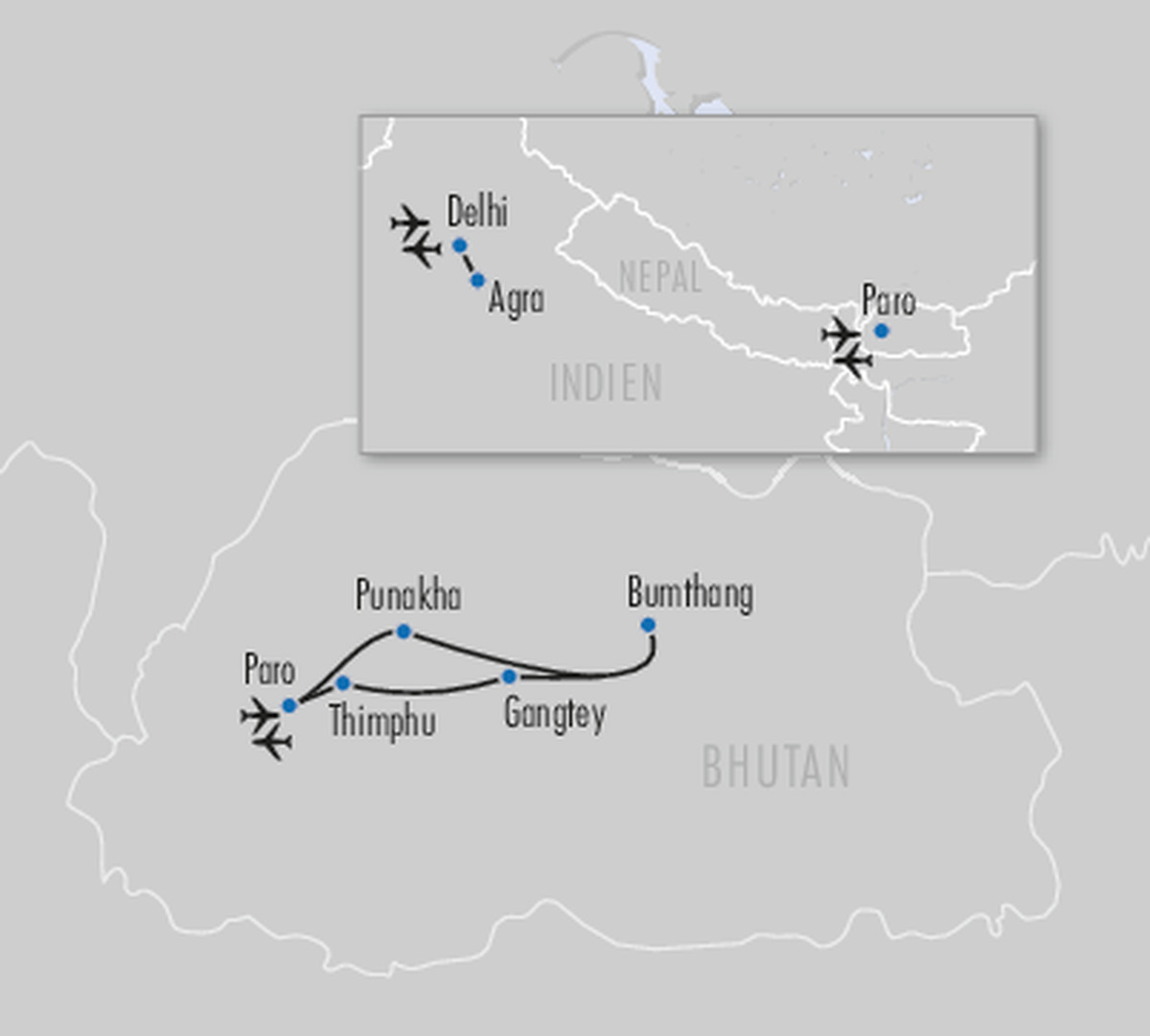 - Stanglmeier-Erlebnisprogramm inkl. 12 Erlebnistagen mit Reiseleitung: Liebesdenkmal (Zugfahrt Delhi-Agra-Delhi, Besuch Taj Mahal & Besuch Agra Fort), Kuzuzangpola (Thimphu: Trashichho Dzong), Königliche Hauptstadt (Thimphu: Buddha Dordenma, Gagyel Lhundrup Weaving Centre, Memorial Chorten, Zorig Chusum, Nationalbibliothek & Papierfabrik), Hoch hinaus (Dochula-Pass, Wangduephodrang, Pele La Pass & Gangtey Kloster), Spuren der Natur (Wanderung Gangtey Nature Trail & Crane Information Centre), Täler und Pässe (Pele La-Pass, Chendebji Chorten, Trongsa Dzong, Yotong-La Pass, Chumey-Tal & Weberei), Tal der Klöster (Bumthang: Wanderung Three Temples-Valley Walk, Kloster Jambay Lhakhang, Bauernhof, Kloster Kurjey Lhakhang, Brauerei & Käserei), Göttlicher Narr (Royal Heritage Museum & Kloster Chimi Lhakhang), Flussgenuss (Wanderung Kloster Khamsum Yuelley Namgyal Chorten & Punakha Dzong), Zeitreise (Dochula-Pass & Paro: Nationalmuseum & Tempel Kyichu Lhakhang), Tigernest (Paro: Kloster Taktsang & Besuch bei einer Bauernfamilie) & Namaskar (Stadtbesichtigung Delhi)