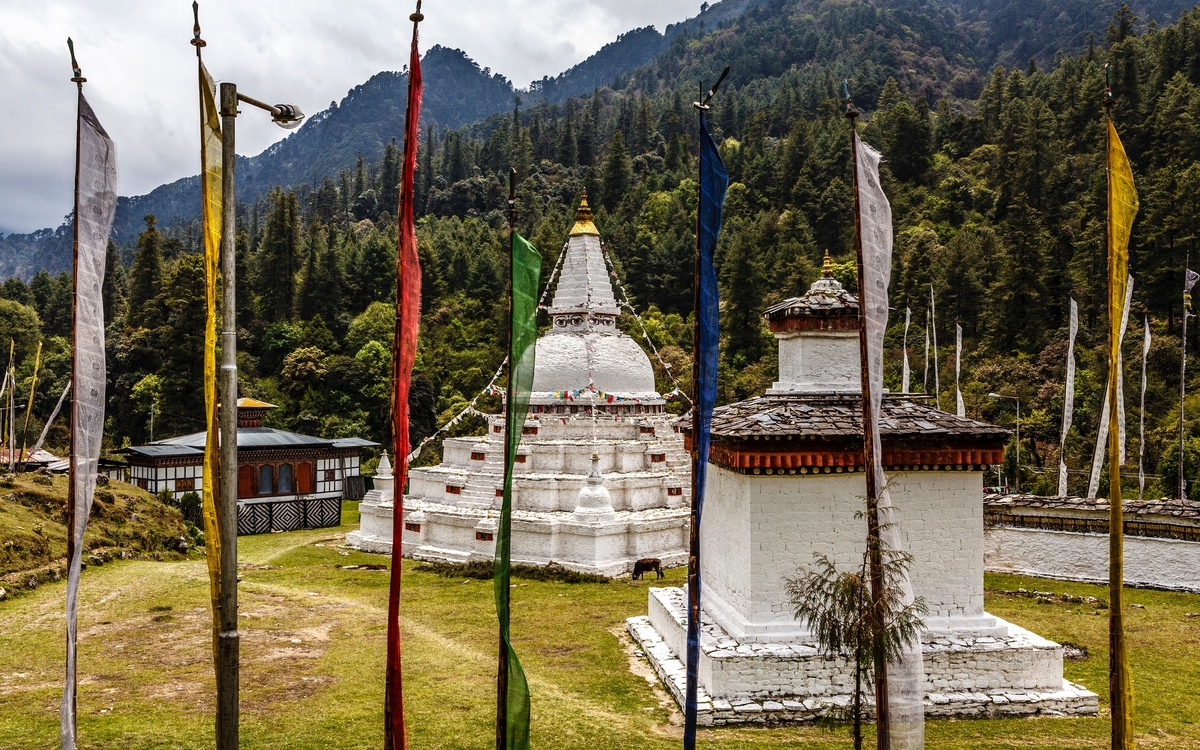 Sie verlassen Gangtey und überqueren erneut die Black Mountain Range, die West- und Zentralbhutan trennt, über den Pele La-Pass. Mitten im satten Grün eines weiten Tals, fernab großer Siedlungen, erscheint der Chendebji Chorten wie aus dem Nichts, ein friedvoller Ort der Einkehr und des Gebets. Erbaut im 18. Jahrhundert im Stil des berühmten Boudhanath-Stupas in Nepal, beeindruckt der weiß getünchte Chorten mit seinen klaren Linien, bunten Augenmalereien und der vollkommenen Symmetrie. Ihr nächster Stopp ist der Trongsa Dzong, eine der imposantesten Klosterburgen Bhutans. Mit seinen verschachtelten Innenhöfen, kunstvoll bemalten Fassaden und endlosen Korridoren scheint er sich regelrecht an die steilen Hänge zu schmiegen – ein Bauwerk von überwältigender Präsenz. Sie überqueren den 3.400 m hohen Yotong-La Pass und erreichen das Chumey-Tal. Hier scheint die Zeit stillzustehen: Bauern arbeiten auf den Feldern, Räucherstäbchen duften vor Hausaltären und Gebetsfahnen flattern in der klaren Bergluft. Besonders bekannt ist das Tal für seine Webkunst. In kleinen Familienbetrieben entstehen hier kunstvolle Yathra-Stoffe aus Schafwolle – farbenfroh, robust und tief verwurzelt in der regionalen Kultur. Ein Besuch in einer Weberei bietet die Möglichkeit, das alte Handwerk aus nächster Nähe zu erleben. Sie erreichen Bumthang. Übernachtung in Bumthang (1/2).