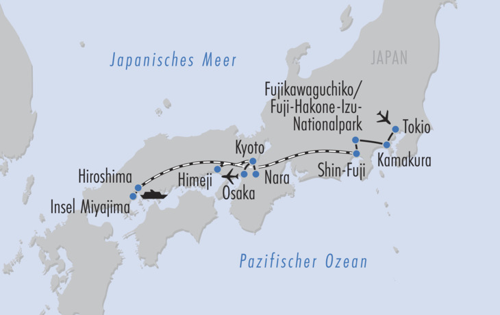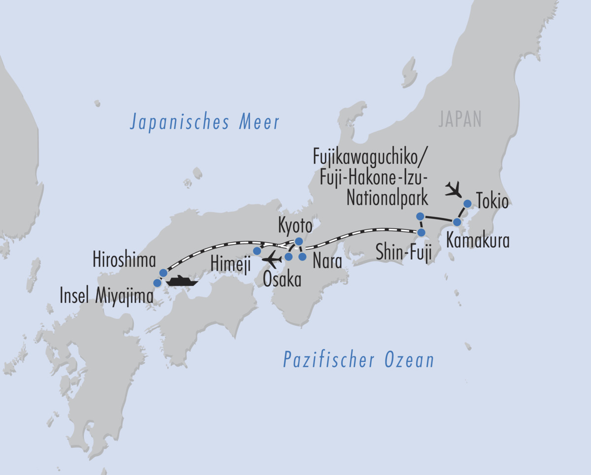 - 10x Übernachtung in Rundreisehotels (3x Sunroute Plaza Shinjuku in Tokio, 1x Toyoko Inn Fuji Kawaguchiko Ohashi in Kawaguchiko, 2x Mitsui Garden Hiroshima in Hiroshima & 4x Sotetsu Fresa Inn Kyoto-Hachijoguchi in Kyoto – oder vergleichbar)