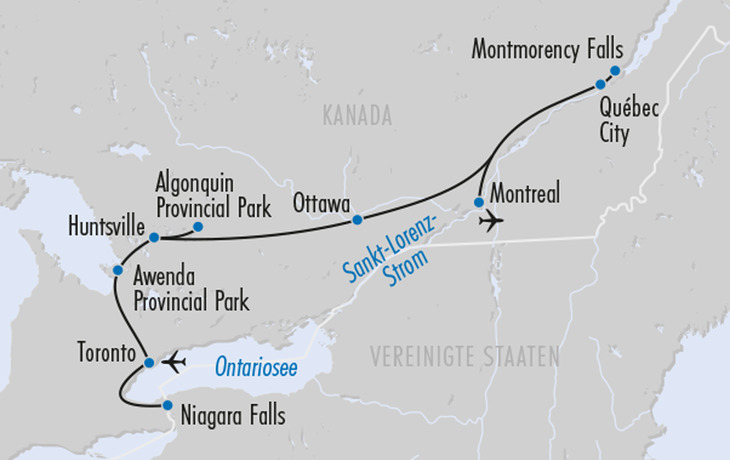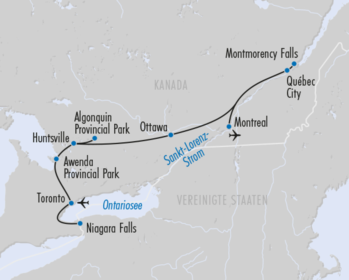 • Stanglmeier-Erlebnisprogramm inkl. 9 Erlebnistagen mit Reiseleitung: Kontraste und Kulturen (Stadtbesichtigung Toronto), Tosende Naturwunder (Tagesausflug Niagara Fälle inkl. Hornblower Cruise & Niagara-on-the-Lake), Wo Wälder leuchten (Awenda Provincial Park inkl. Spaziergang Dunes Trail & Wendat Trail), König des Indian Summers (Algonquin Provincial Park inkl. Lookout Trail, Track and Tower Trail & Mizzy Lake Trail), Hauptstadtflair (Stadtbesichtigung Ottawa), Altfranzösische Eleganz (Stadtbesichtigung Québec City), Wasser trifft auf Genuss (Montmorency Falls & Île d’Orléans) & Frankreich trifft Nordamerika (Stadtbesichtigung Montréal)