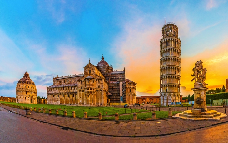 Heute erkunden Sie Pisa – eine Stadt, die einst als mächtige Seerepublik das Mittelmeer prägte und noch heute mit ihrem Reichtum an Kunst und Architektur beeindruckt. Auf dem berühmten „Platz der Wunder“ liegen die Wahrzeichen dicht beisammen: Der majestätische Dom, das runde Baptisterium, der ehrwürdige Camposanto und natürlich der weltbekannte Schiefe Turm, dessen elegante Neigung bis heute fasziniert. Weiter geht es in das beschauliche Lari, ein typisch toskanischer Ort, der sich rund um eine alte Festung schmiegt und einen herrlichen Ausblick auf die umliegende Hügellandschaft bietet. In den ruhigen Gassen scheint die Zeit stehen geblieben zu sein. Ein Highlight bildet der Besuch in einer Pastamanufaktur. Hier wird Pasta noch wie früher hergestellt: von Hand, mit besten Zutaten und viel Geduld. Ein Blick hinter die Kulissen dieses Familienbetriebs zeigt, wie eng in der Toskana Tradition und Genuss miteinander verbunden sind.