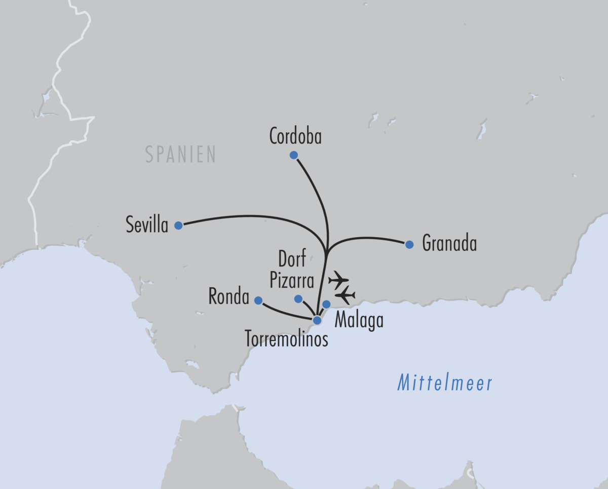 Ihre Stanglmeier-Reisebegleitung erwartet Sie am Flughafen München. Mit Lufthansa fliegen Sie nun in gut drei Stunden nach Málaga an der Costa del Sol. Dort angekommen werden Sie bereits erwartet. Auf dem Weg zu Ihrem Hotel können Sie sich auf eine spannende Stadtbesichtigung durch Málaga freuen. Die Stadt verfügt über ein reiches künstlerisches Erbe und ist der Geburtsort des weltbekannten Pablo Picassos. Málagas historisches Zentrum ist ein bezauberndes Gewirr enger Gassen, unterbrochen von der hoch aufragenden, kunstvollen Fassade der Renaissance-Kathedrale, die wegen ihres unvollendeten zweiten Turms liebevoll „La Manquita“ genannt wird. Die von Orangenbäumen gesäumten und im Sonnenlicht gesprenkelten Straßen der Stadt führen zu architektonischen Wunderwerken wie der majestätischen Festung Alcazaba, die auf einem Hügel thront und einen Panoramablick über das azurblaue Wasser und den geschäftigen Hafen darunter bietet. Danach erreichen Sie Ihr Hotel, wo Sie den restlichen Tag entspannen können.