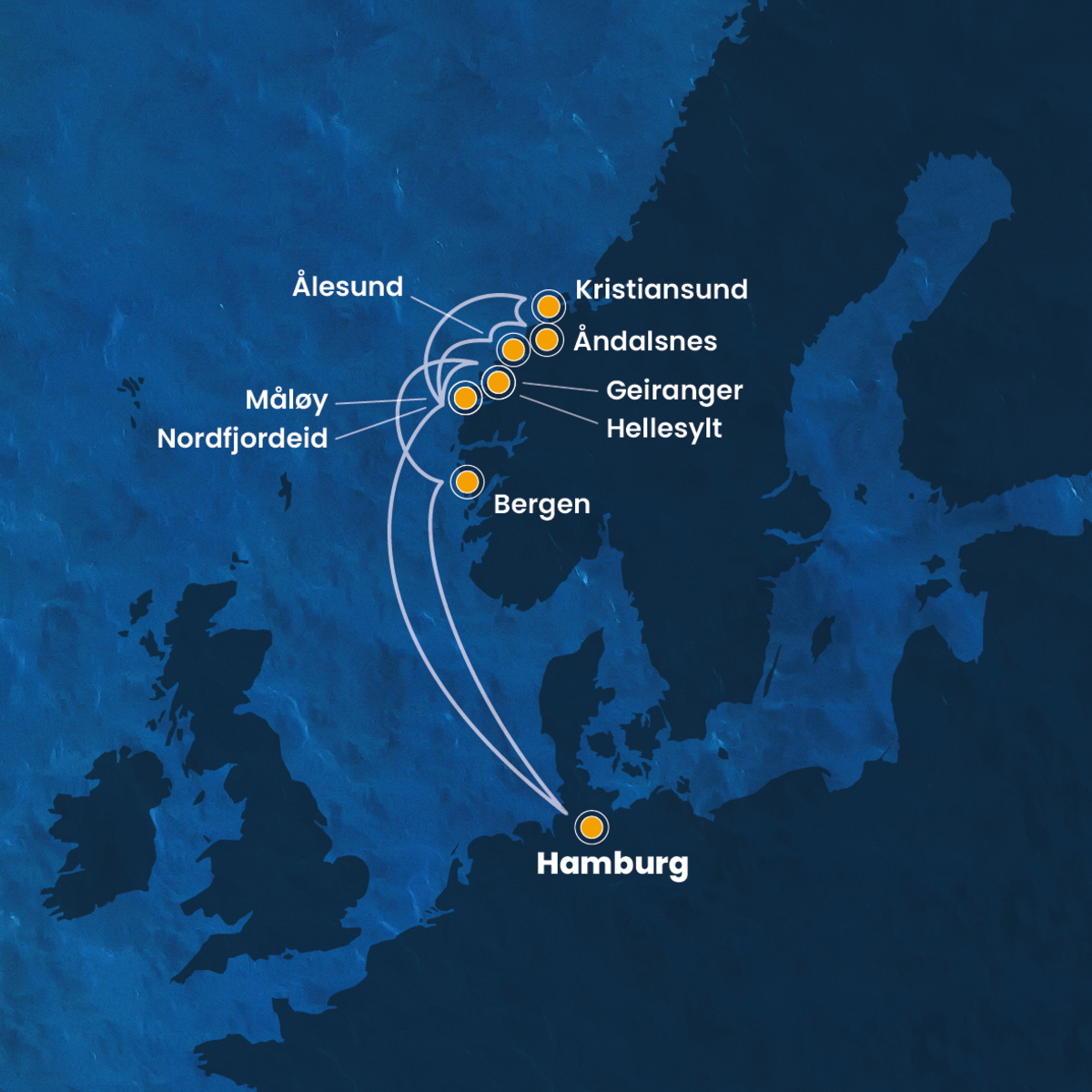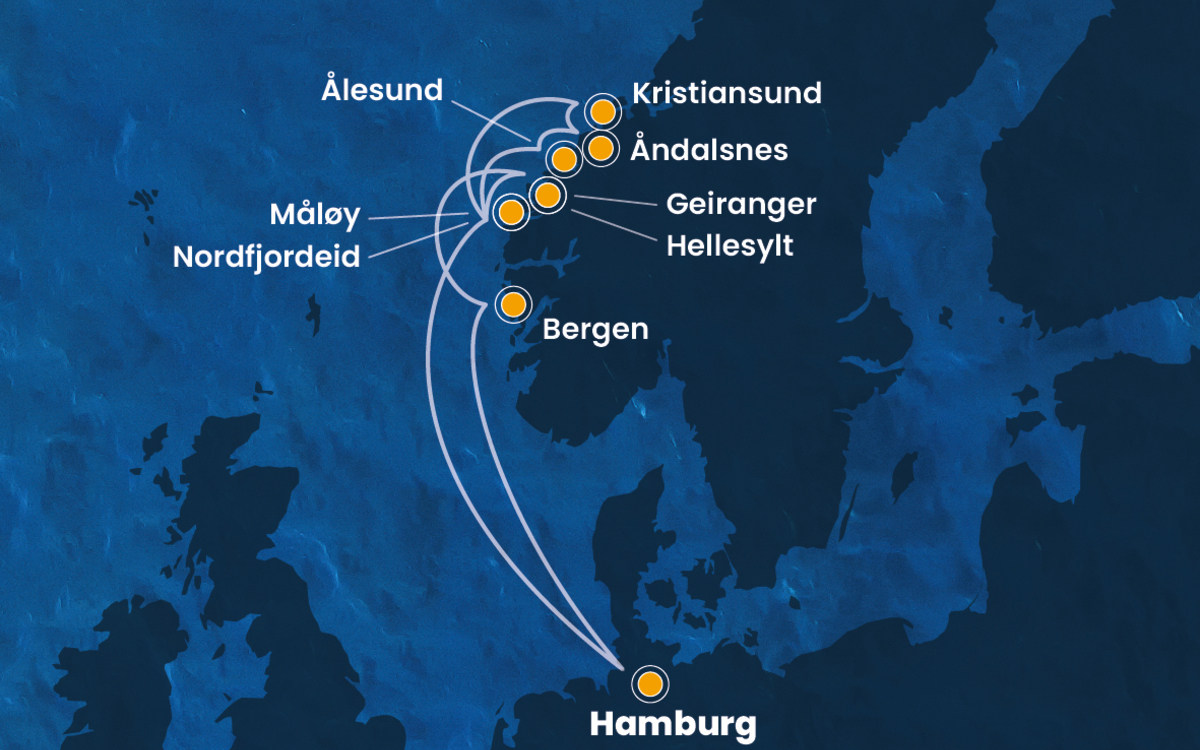 Kommen Sie an Bord und entdecken Sie auf dieser faszinierenden Norwegen-Kreuzfahrt ab/bis Hamburg die eindrucksvollsten Fjordlandschaften Skandinaviens. In Maløy erwartet Sie eine charmante Küstenstadt mit dramatischer Naturkulisse – weiße Strände, steile Klippen und das berühmte Kannesteinen-Felsmonument machen diesen Ort einzigartig. Weiter geht es nach Kristiansund, einer lebendigen Hafenstadt, die sich über vier Inseln erstreckt und mit ihrer klippigen Umgebung und der typischen Klippfischkultur fasziniert. In Åndalsnes, dem „Alpenort am Fjord“, laden majestätische Berge wie der Trollveggen und spektakuläre Ausblicke von der Raumabanen-Bahnstrecke zu unvergesslichen Naturerlebnissen ein. Ålesund verzaubert mit seiner eleganten Jugendstilarchitektur, seinen Kanälen und der Aussicht vom Hausberg Aksla – ein perfekter Mix aus Stadtflair und Natur. In Nordfjordeid erleben Sie norwegische Geschichte hautnah, etwa im Sagastad-Wikingerzentrum, und genießen atemberaubende Blicke auf Gletscher, Fjorde und Berge. Der legendäre Geirangerfjord, UNESCO-Welterbe, beeindruckt mit steilen Felswänden, tosenden Wasserfällen wie den „Sieben Schwestern“ und einer der schönsten Schiffsanfahrten der Welt. Abschließend empfängt Sie Bergen, das Tor zu den Fjorden, mit seinen bunten Bryggen-Giebelhäusern, dem lebhaften Fischmarkt und der Möglichkeit, mit der Fløibanen-Seilbahn hoch über die Stadt zu schweben. Ein unvergesslicher Mix aus Naturwundern, nordischer Kultur und maritimem Flair erwartet Sie auf dieser Reise durch Norwegens beeindruckende Fjordwelt.
